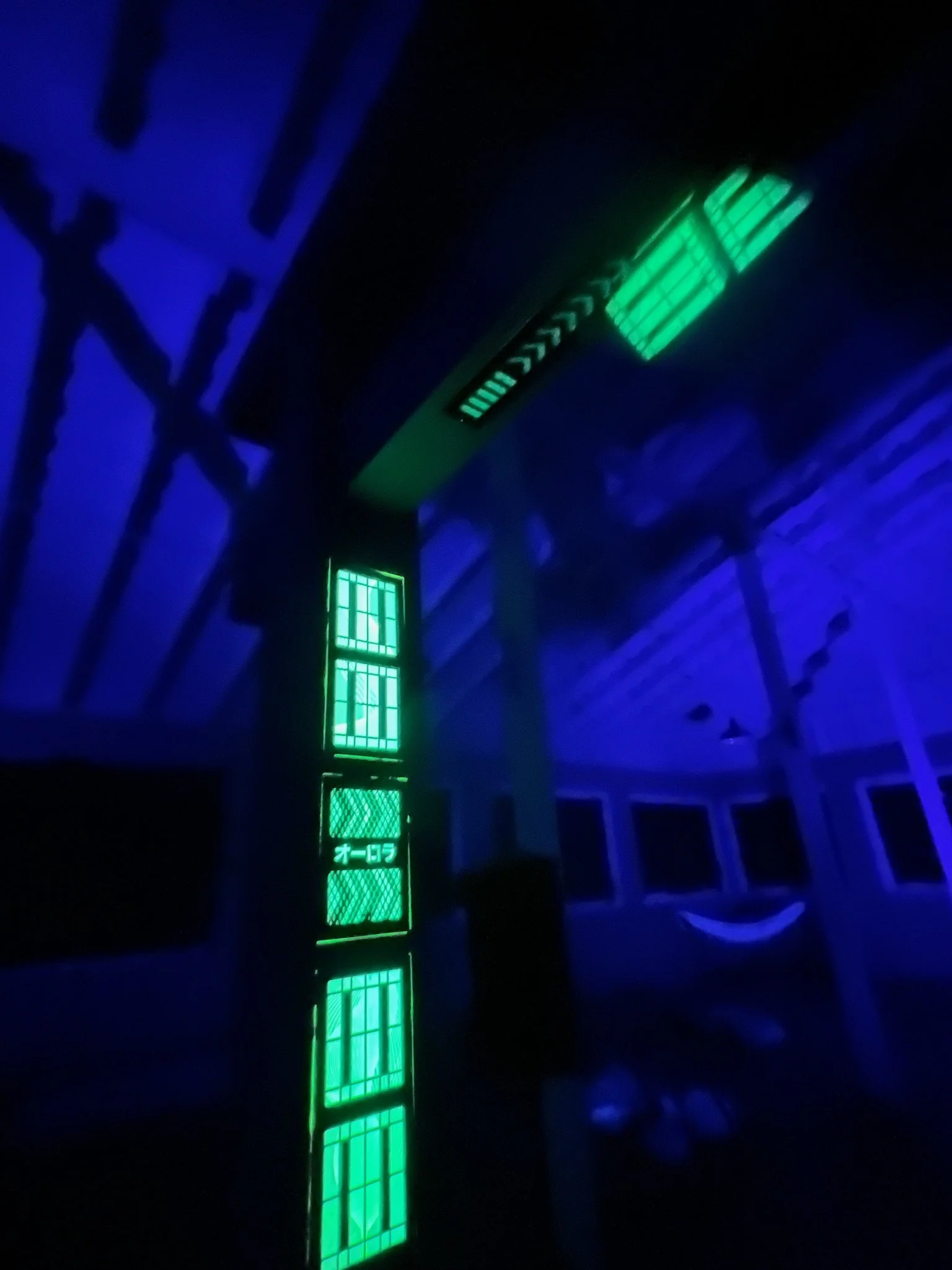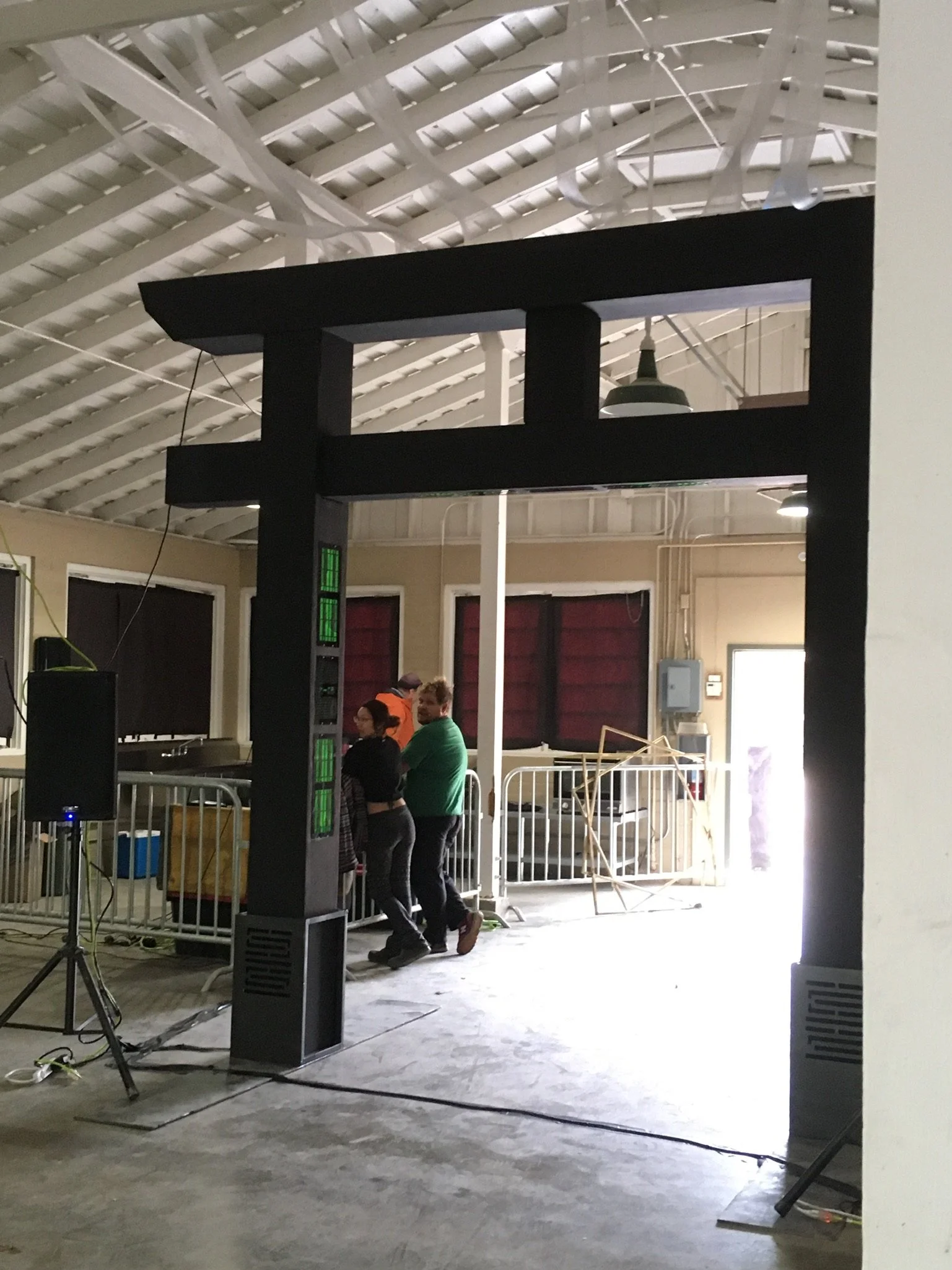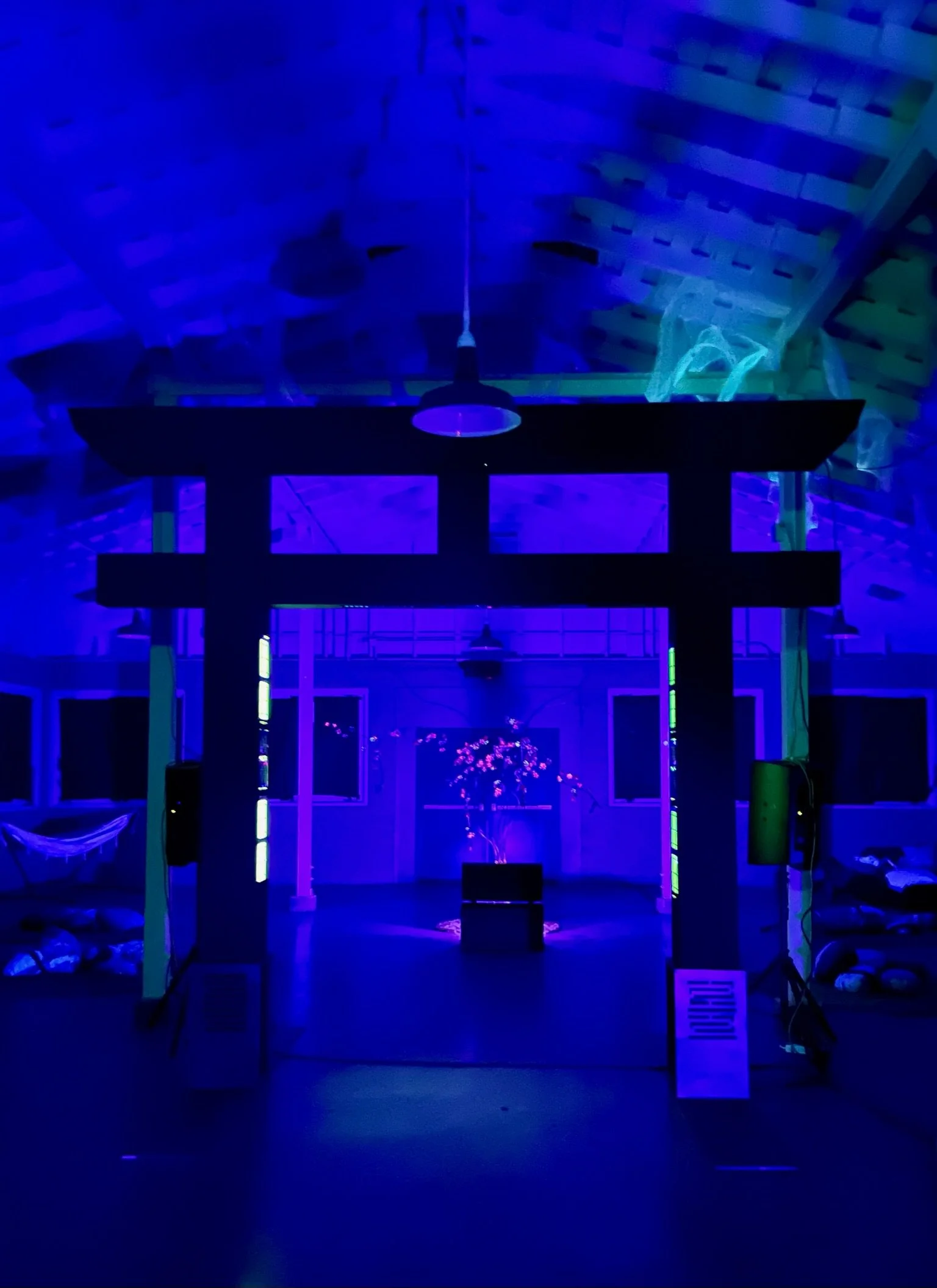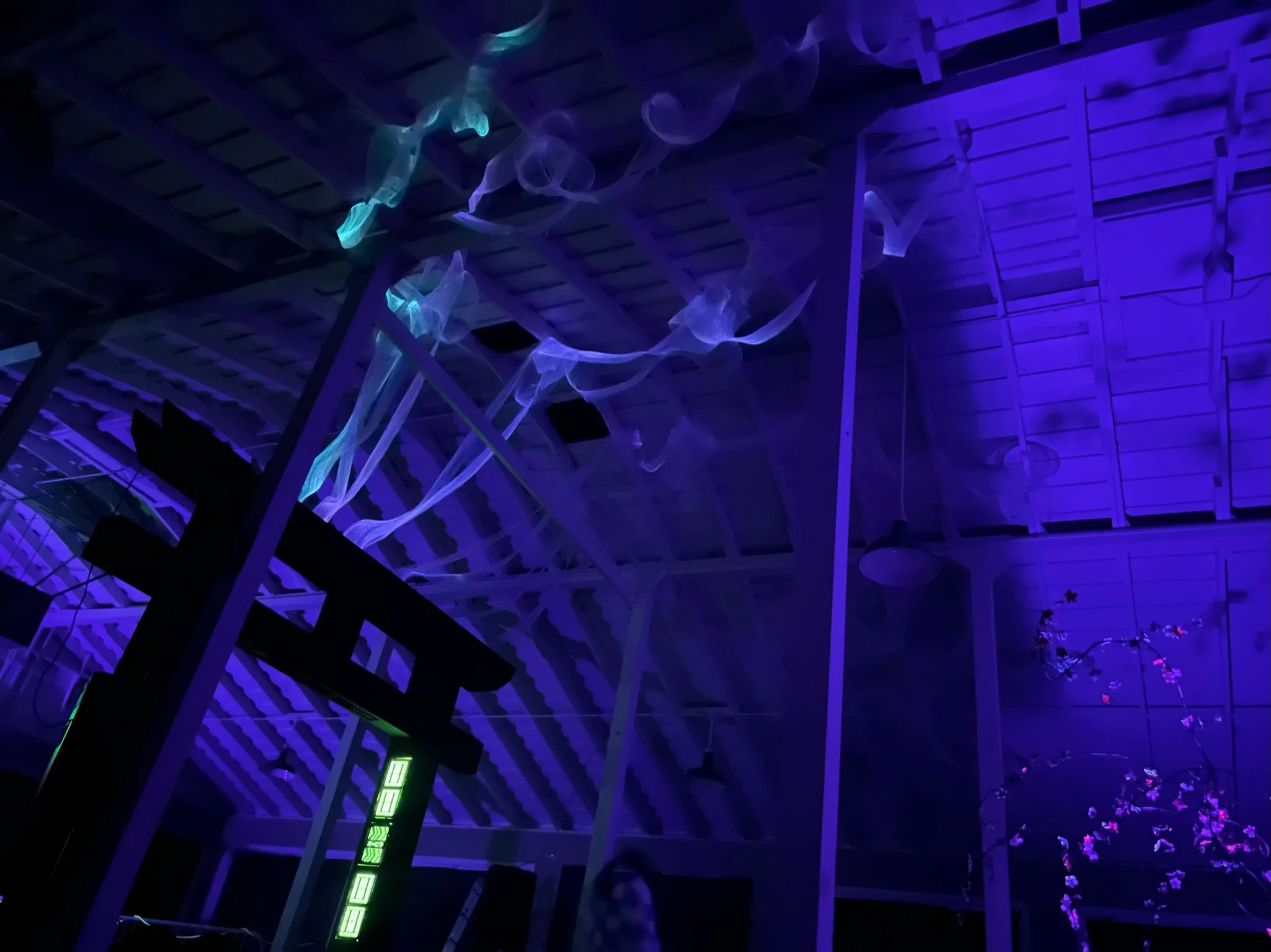 Aurora was a multimedia installation created to share the feeling of the northern lights and to connect two places from my life — Okinawa and Alaska. The centerpiece was a cyberpunk-inspired torii gate with six sixty-foot loops of side-glow fiber-optic mesh rising from the top.